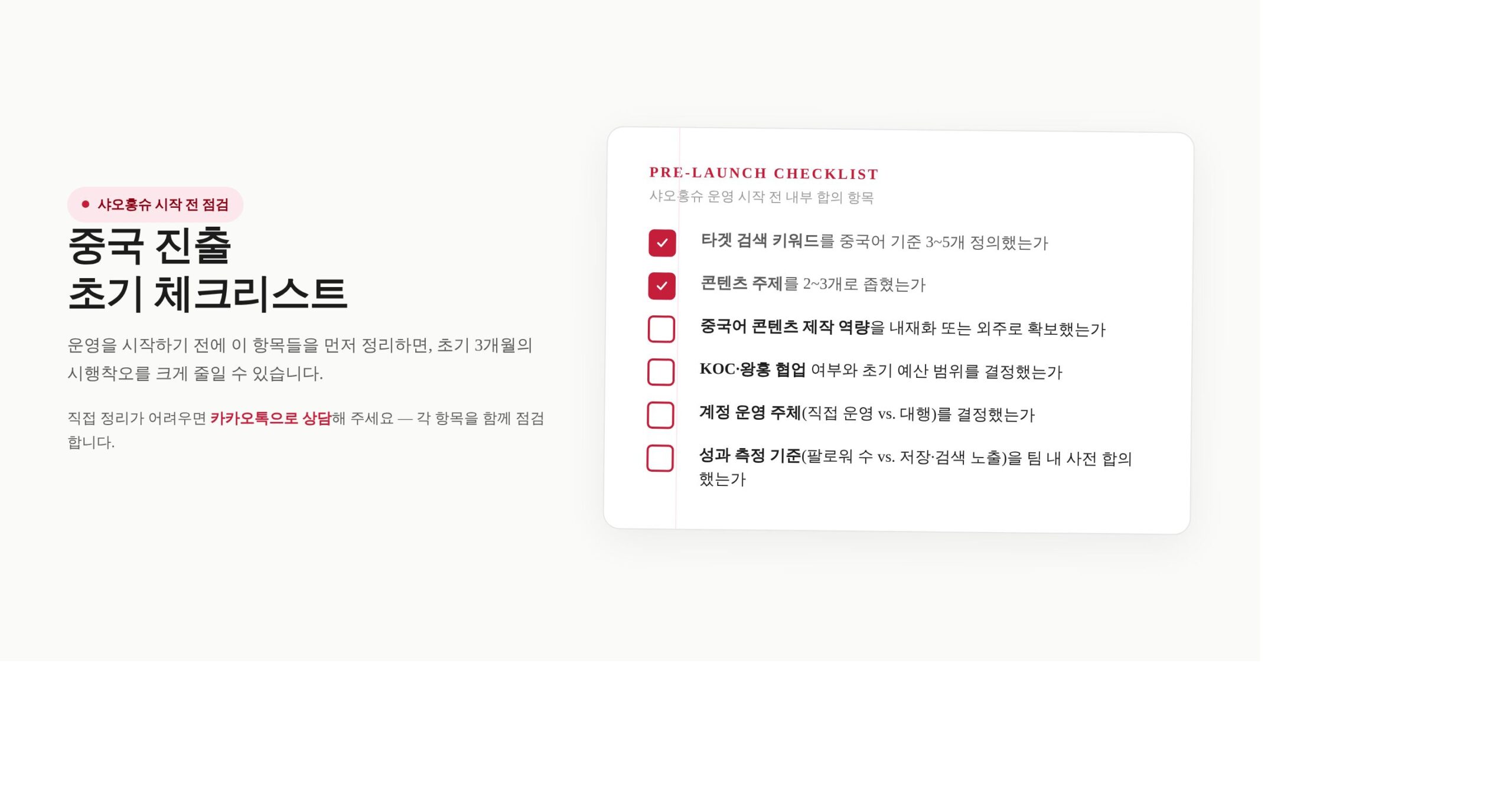 샤오홍슈는 한국 브랜드의 중국 진출 전략을 처음 세울 때 반드시 검토해야 할 플랫폼입니다. 계정 설계, 왕홍·KOC 협업, 초기 운영까지 — 처음 중국 시장에 진입하는 브랜드를 위한 실무 가이드입니다.